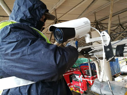 圖為工作人員正在安裝攝像頭