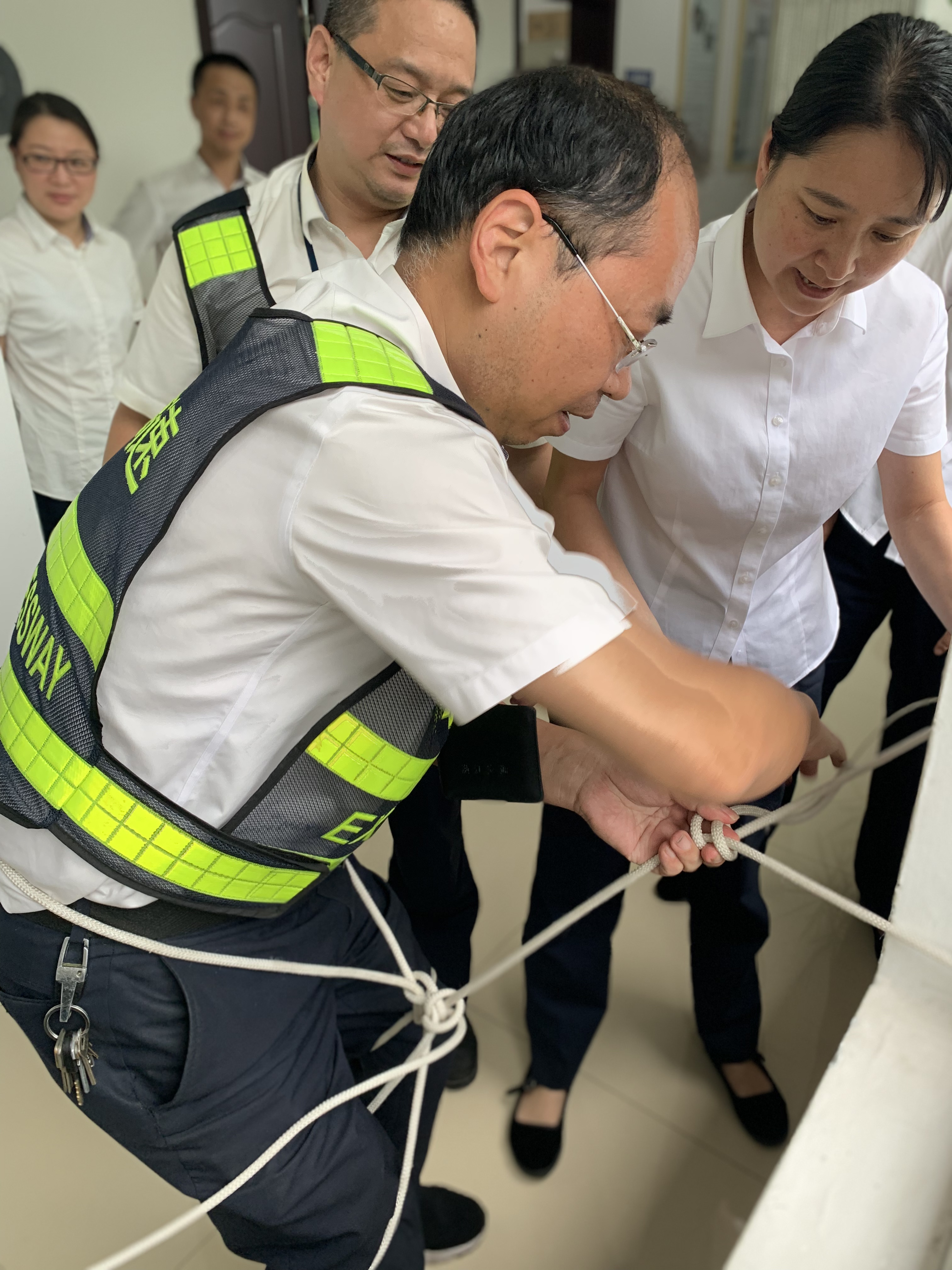 “繩”采飛揚 ——記臨海南收費所逃生繩技能大比武活動 “加油、加油!” “快快快,繩子給我,輪到我啦!” “不對不對,繞三圈從中間穿過去!” 臨海南收費所辦公樓二樓樓道上,不時傳出陣陣掌聲、吶喊聲,7月15日至7月17日,該所以各收費班組為參賽單位,以“增強消防安全意識,提升應急逃生技能”為主題,開展逃生繩技能大比武活動。