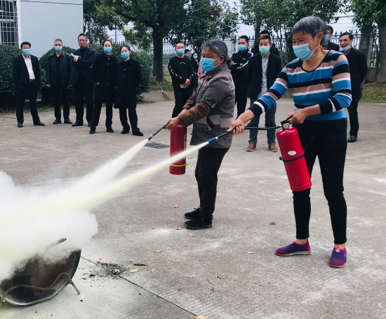 圖為使用滅火器演練 隨后,該所開展滅火器使用模擬演練。在演練中,大家利用平時(shí)更換下來的舊滅火器,依次輪流進(jìn)行操作,更有一些員工主動熱心幫助保潔阿姨們講解如何正確使用滅火器,以身示范正確操作方式及每一個(gè)分解動作要領(lǐng)。