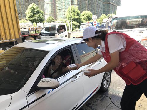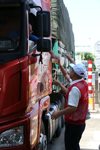 圖為志愿者給過(guò)往司機(jī)遞上清涼飲品