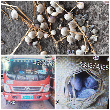 11月2日上午10:39分左右,車牌為浙J6HA83的小貨車駛?cè)霚貛X西收費所2號崗?fù)ぃ撥囻{駛員稱自己運載的貨物為綠農(nóng)產(chǎn)品,要求免費,堵塞車道一個多小時。最后在取證報警下,駕駛員交付通行費320元。 該車被篷布包著,車上貨物又被袋子緊緊包著。當工作人員要求檢查取證時,駕駛員只摳開指定的袋子,并且口子開得非常小,只讓人隱約看到貨物是貝殼。工作人員按規(guī)定要求駕駛員打開另一處取證,駕駛員以貨物被繩子綁著不好打開為由,只在前端把袋子摳了一個比硬幣大點的小洞,拿出幾個貝殼,工作人員看到其拿出的貝殼不管是在大小還是顏色上,都和他剛才指定的那袋貨物有明顯區(qū)別,于是工作人員親自用手摸進去查驗,經(jīng)仔細檢查,貨物屬于貝殼中的殘次品,懷疑是飼料用途。