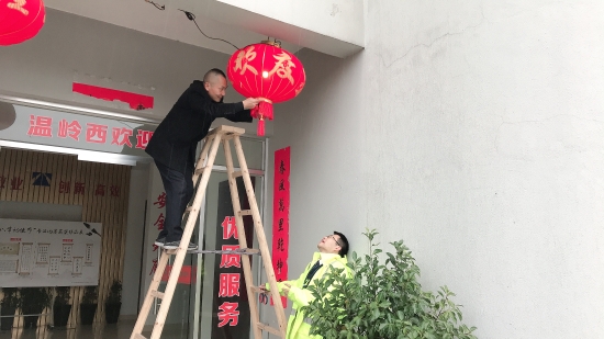 圖為工作人員共同裝扮收費所 此次活動,溫嶺西收費所本著大氣、熱烈、節儉的原則,在食堂、辦公樓、操場等區域掛上燈籠、拉上彩旗、貼上福字和對聯,在收費內廣場護欄處插上彩旗,有了這些裝扮,整個站所處處洋溢著喜氣洋洋、新穎美觀的節日氛圍。此外,員工們還自發在站所打掃衛生清理垃圾,重點對辦公樓、宿舍區及收費崗亭和內外廣場等區域的環境衛生進行全方位清掃。各班組齊心協力共同打掃,為春節掃塵。經過大家的努力,整個站區呈現出整潔優美的工作環境,向過往司乘充分展示溫嶺西收費所的良好精神風貌。