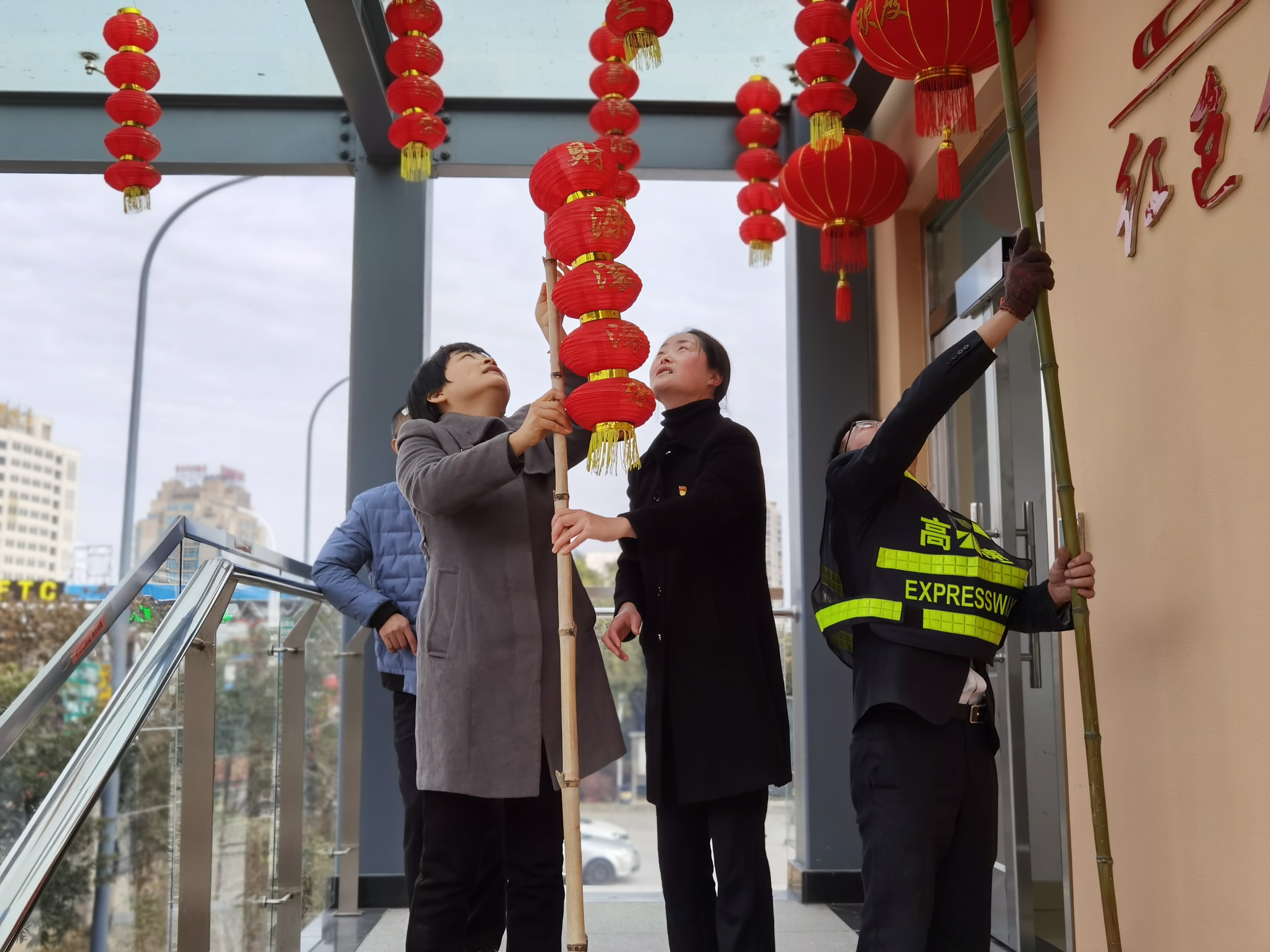 大家分工合作,搬梯子、遞春聯(lián)、貼膠帶、校正高低。在站所內(nèi)每個(gè)角落都掛上了紅彤彤的燈籠;收費(fèi)區(qū)域內(nèi)廣場兩邊的欄桿上扎著一面面彩旗。一幅幅精致喜慶的對聯(lián)、“福”字,一串串三角彩旗,一個(gè)個(gè)大紅燈籠把整個(gè)收費(fèi)站所點(diǎn)綴得處處洋溢著濃厚的節(jié)日氛圍,“年味”十足,讓在站員工和過往司乘朋友感受到新年的喜慶氛圍和“家”的溫暖。