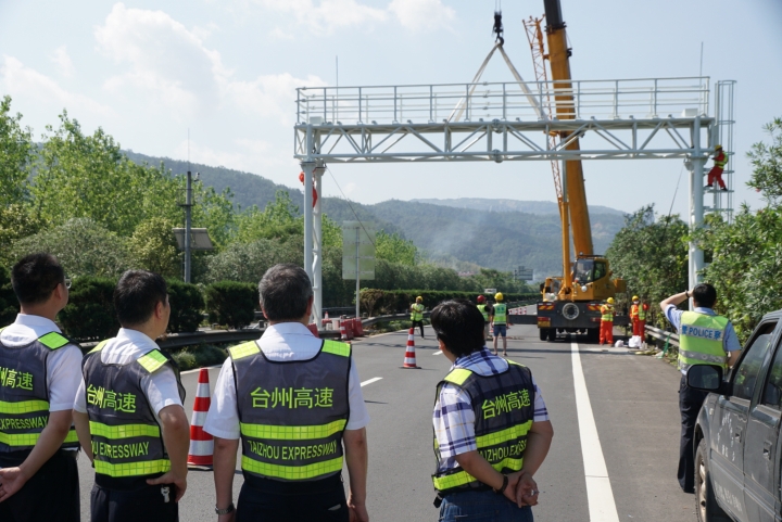 9月7日上午,首個自由流主線虛擬收費站龍門架,在甬臺溫高速公路臺州段溫州方向主線K1668+200M處現(xiàn)場完成吊裝,標(biāo)志著取消省界收費站工作邁出了堅實的一步。集團董事長、總經(jīng)理陳文波在吊裝施工現(xiàn)場視察指導(dǎo)工作。集團總工程師江輝,高速交警、施工單位、監(jiān)理單位、工程部等人員陪同。
