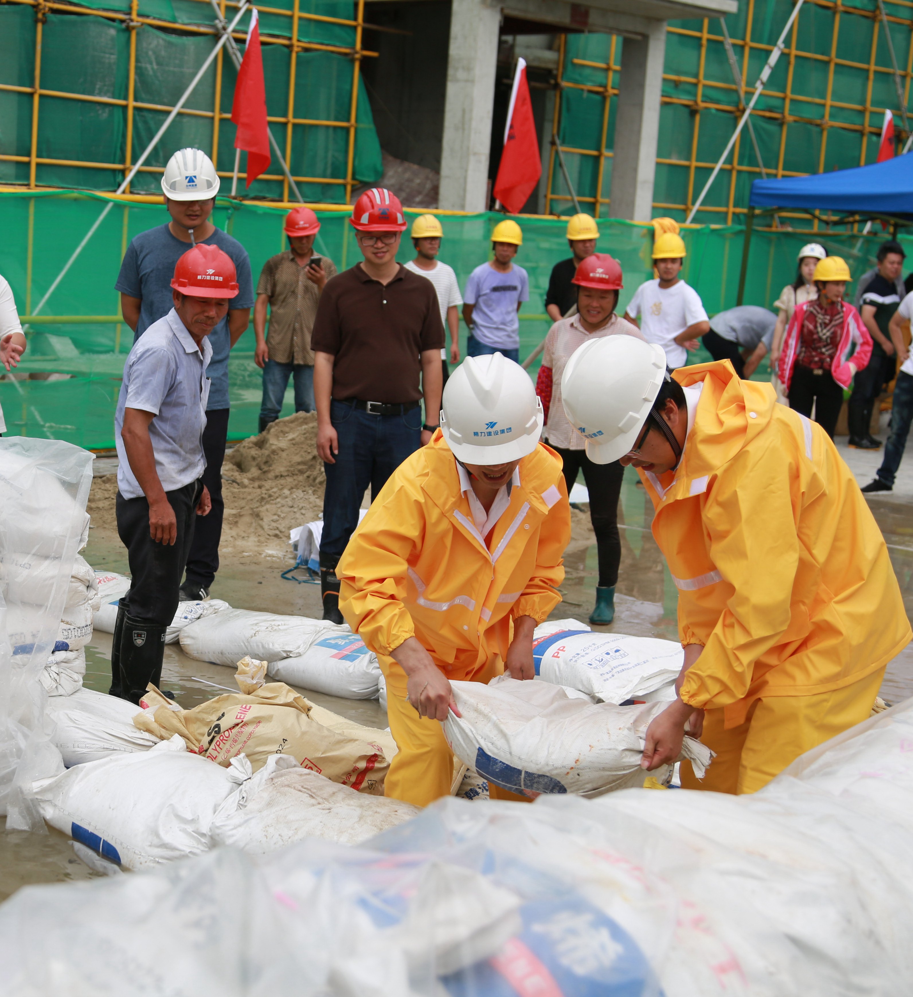 圖為活動動員現場 “第一組演練人員,準備……”隨著集團安全總監項同富一聲令下,應急演練的第一個科目沙包圍堰防洪開始,應急搶險小組人員和房產施工單位代表隊聽到指令后立刻趕到用沙包圍成的兩個大水池附近。