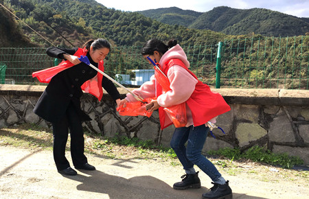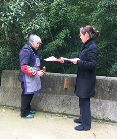 圖為女職工向當(dāng)?shù)乩先诵麄髑迕魑拿骷罀?/span> 然而,女職工們卻不“安分守己”,以這樣的方式來慶祝自己的節(jié)日:她們兵分二路,一路擔(dān)起森林防火宣傳員,向過往群眾發(fā)放《清明文明祭掃和森林防火倡議書》,并對(duì)上了年紀(jì)的村民耐心講解倡議書內(nèi)容,將臺(tái)州高速的文明服務(wù)從工作中延伸到了生活中。一路環(huán)繞水庫去清理其邊上的垃圾,一上午下來,收獲還真不少,共清理廢紙、飲料罐、塑料袋等廢棄物若干袋,在打造“生態(tài)文明”中率先垂范,擔(dān)其責(zé),盡其力。