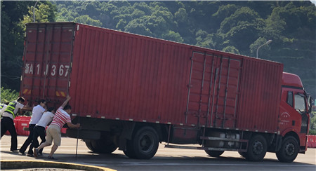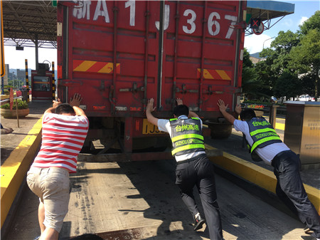 6月19日15時(shí)左右,一輛杭州牌照的大貨車,在進(jìn)入臨海南收費(fèi)所三車道時(shí)突然熄火拋錨,司機(jī)嘗試了幾次無法啟動(dòng),立刻下車檢查車況。 “師傅,怎么了?有什么能幫您?”收費(fèi)員徐海源見此情景,立即上前熱心詢問。 “哎!包在油箱口的塑料紙?jiān)趺淳偷暨M(jìn)油箱內(nèi),現(xiàn)在車子怎么都發(fā)不動(dòng)不了。”司機(jī)有點(diǎn)發(fā)急地回答。 “師傅,別著急,我先找?guī)讉€(gè)同事幫您把車推出車道。”收費(fèi)員趕緊安慰司機(jī)焦急心情。 “好的,那謝謝你們。”司機(jī)連忙點(diǎn)著頭。為了避免車道堵車,徐海源立刻利用對(duì)講機(jī)向當(dāng)班班長(zhǎng)周萍說明情況,周萍立刻關(guān)閉該車道,啟動(dòng)備用車道。此時(shí)此刻,收費(fèi)員李俊杰、楊旭佳毫不猶豫的趕了過來與駕駛員一起推動(dòng)車子。“一、二、三,一、二、三,使勁呀……”可是車子仍然紋絲不動(dòng)。怎么辦?請(qǐng)求支援!正準(zhǔn)備下班的行政人員陳瑩、劉華萍得知情況后,二話不說飛奔到車道,加入到推車行列中。用力推呀——哎,不行;再來一次——還不行。面對(duì)23.97噸的大貨車,大家仍是束手無策。“去找根鐵棒試試!有道是給你一根鐵棒,我能翹起整個(gè)地球。”不知是誰大喊了一聲。“行,可以試試,快去找”話音剛落李俊杰快步跑向所內(nèi),尋找鐵棒。不一會(huì)兒,只見他興奮地高舉鐵棒沖著大家喊道:“找到了!找到了!”