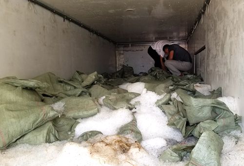 李貴陽打開車輛后廂門,迎面撲來一陣冷風,一眼望去車廂里面全部是一袋袋的花蛤,上面還壓著袋裝的冰塊和零碎的碎冰,車廂內(nèi)部看不清楚。憑借多年的工作經(jīng)驗和認真負責的工作態(tài)度,李貴陽二話沒說,直接爬上濕滑的車廂,踏過冰袋和碎冰,深入到車廂里面去檢查,把冰袋掀開后,結(jié)果發(fā)現(xiàn)下面全部是空桶。原來這樣做既可以增加貨物面積也可以使重量加重,從而達到綠農(nóng)政策的免費通行要求。