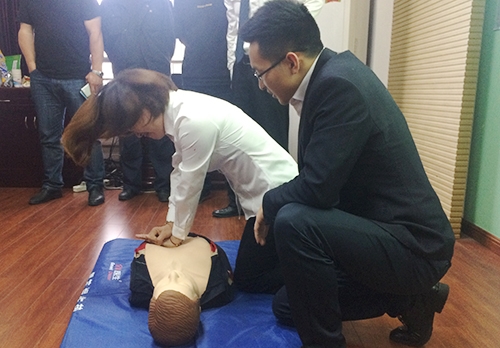 圖為參加培訓的人員 本次培訓特別邀請杭州五進健康管理服務中心湯瑞芳老師到場授課,為大家講授意外事故急救方法與步驟,職業(yè)病、慢性病預防等知識。授課過程中,參訓人員彼此互動,并利用CPR假人模型實踐現(xiàn)場急救,根據(jù)參會員工的實際情況現(xiàn)場演示職業(yè)病、慢性病的檢查與防治方法,課程氣氛熱烈。