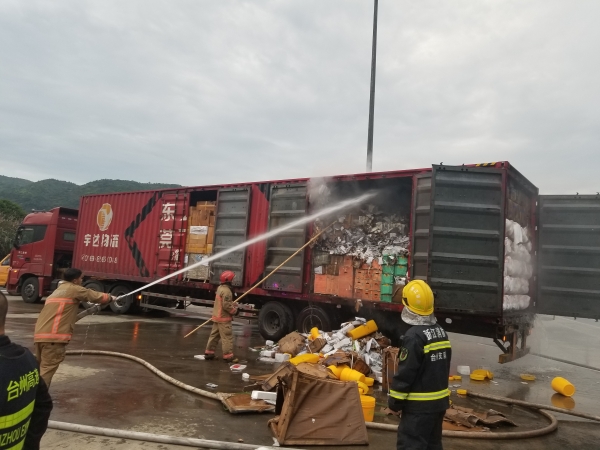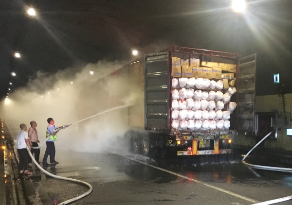 萬(wàn)幸的是,恰逢溫州高速交警巡邏車經(jīng)過,隨即在該貨車后方預(yù)警,很快的所巡邏車、消防車先后到達(dá)現(xiàn)場(chǎng)協(xié)同滅火。由于該車貨物較多,且裝載物皆為紙箱和塑料,集裝箱底層溫度較高,一時(shí)只能將明火撲滅,但車廂內(nèi)仍有大量煙霧,為了安全,車子必須盡快撤離隧道,執(zhí)勤隊(duì)當(dāng)即決定讓駕駛員把車開往南廣場(chǎng)繼續(xù)滅火,消防車則一路緊隨其后滅火,以防火勢(shì)變大。