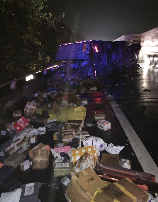 7月14日凌晨1點(diǎn),溫州方向臺(tái)州南收費(fèi)所附近,一輛半掛型大貨車和一輛快遞車相撞,半掛車直接沖出高速,四腳朝天。快遞車則是被巨大的沖擊力撞向了硬路肩,側(cè)翻中撒下數(shù)十米的貨物。1點(diǎn)10分,救援車輛到達(dá)現(xiàn)場(chǎng),現(xiàn)場(chǎng)一片狼藉,防撞護(hù)欄板、護(hù)欄柱損傷嚴(yán)重,橋梁鋼管都折斷了不少。