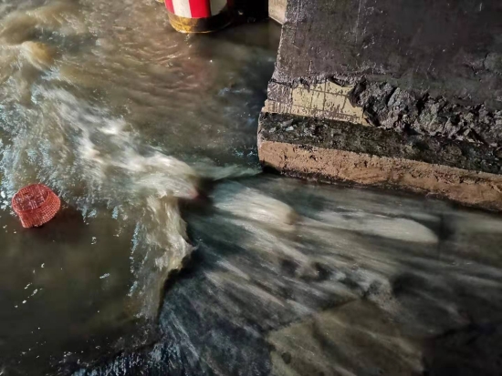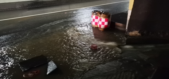 圖為車道水流 當(dāng)晚19:12分,黃土嶺隧道所中控員徐彤霞發(fā)現(xiàn)寧向隧道主車道路面出現(xiàn)積水,如不及時處置,路面濕滑會讓過往車輛打滑,嚴(yán)重影響隧道的安全暢通。為了杜絕安全隱患,管理所立即啟動防汛應(yīng)急方案,中控員第一時間在管理群發(fā)送現(xiàn)場圖片,并在同一時間通知執(zhí)勤隊與監(jiān)控中心。 執(zhí)勤隊員不顧狂風(fēng)暴雨趕赴現(xiàn)場,19:19分,斜井現(xiàn)場山上倒灌入隧道的水嘩嘩直流,儲水池水流急促,執(zhí)勤隊員立即分工合作,一組在主車道擺放安全錐采取防護(hù)措施,并利用沙包,堵住排水溝壁,使水盡量不往外滲,及時避免了積水對隧道內(nèi)行車造成的安全隱患。一組檢查潛水泵是否正常運(yùn)行,查看積水入侵的原因、排水溝通暢情況。