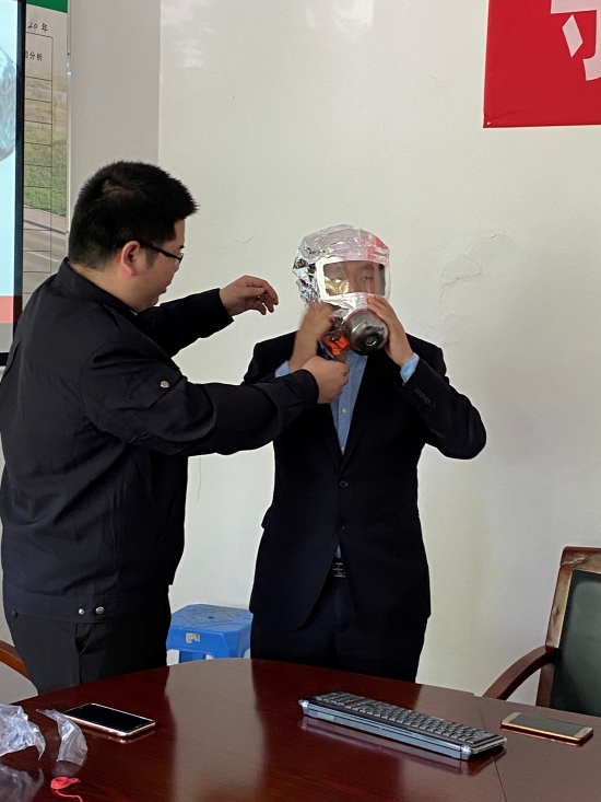 圖為空氣呼吸器佩戴演練 培訓(xùn)分為講座和演練兩個部分。在培訓(xùn)課上,臺州消防大隊楊教官結(jié)合近年來發(fā)生在臺州觸目驚心的火災(zāi)案例,以視頻、圖片的形式生動地闡述了消防安全工作的重要性和嚴(yán)峻性,通過現(xiàn)場展示詳細(xì)介紹了干粉滅火器、水基滅火器的各自特點(diǎn)和使用方法、適用的場所,全面介紹了日常工作生活中應(yīng)注意的消防安全細(xì)節(jié)以及如何撲救初期火災(zāi),火災(zāi)中如何自救、空氣呼吸器佩戴使用、逃生等知識。