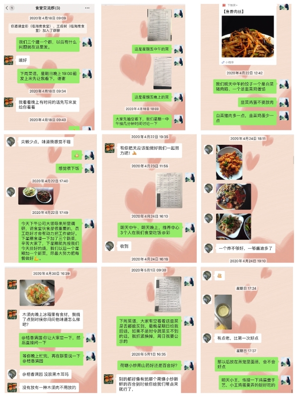 圖為建立食堂交流群 今年4月中旬,所務(wù)陳瑩利用微信建立了食堂交流群,經(jīng)常在群里上傳從網(wǎng)上、廚房APP上下載的一些簡單又美味的家常菜制作方法。并結(jié)合食堂人員的特長,針對季節(jié)變換,合理調(diào)整飲食,做到葷素搭配、飯菜每班一日三餐不重樣等要求,提前列出每周菜譜,要求食堂人員根據(jù)菜譜,每周針對創(chuàng)新家常菜,提前準(zhǔn)備少量食材,精心燒制,待嘗試滿意后再供應(yīng)。
