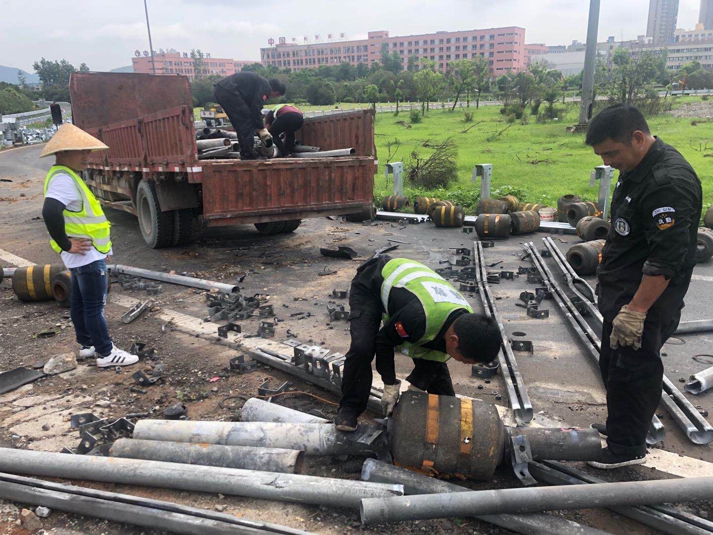 公司多部門聯合處置廢舊物資 7月27日,為協助工程部開展6.13浙江溫嶺槽罐車爆炸事故受損路段維修,盡早恢復通行。資產管理部在本月第二次聯合工程部、計財部、監察室對公司路損防撞護欄板及立柱等廢舊物資進行處置。