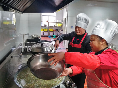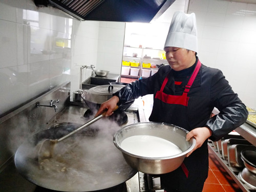 浸了一夜的早米,用石磨磨成米漿,細膩而幼滑,被靜置在盆里。“一般都用米粉泡水,口感粗糙,而且吃起來沒有香頭。”利花一邊說,一邊將香腸切碎與豆腐、冬筍、胡蘿卜、芹菜、香菇、蠶豆瓣翻炒著。旁邊的大鍋里,長長的豆面在骨頭湯里翻滾著,像一棵棵舞蹈的海草。徐徐倒入的米漿,被不停地攪拌,“要是粘到鍋,就會有焦糊味,這鍋羹就算廢了。”米漿好像不夠,利花有些懊惱,“要是在家里,米漿都會多準備一些,不夠就隨手添,我帶到這里就這些,也沒得加了。”就叫在一邊做幫手的妹妹寶花用面粉和山粉(也就是番薯粉)摻水拌起來,倒入鍋里,湯漸漸濃稠起來,倒入之前炒好的配料,加上切得細細的綠綠的芥菜梗、芥菜葉、海蠣,鍋里不時冒起大泡,香氣四溢。 為照顧吃不慣糟羹的同事,食堂還準備了一鍋甜的山粉糊。來自臺州各縣市區的同事,按各自飲食習慣選擇了咸的或甜的。有說芹菜的味道蓋過了芥菜清香的,有說沒有加入芋頭口感不夠糊的,但撲鼻的香氣和濃厚豐富的口感立刻讓人忘了挑剔。對我來說,碧綠的芥菜葉和白胖的海蠣肉是整碗羹的顏值擔當和靈魂所在。 每個元宵節,對于在崗的同事們是沒有花燈可看、沒有燈謎可猜的,也不能與家人聚在一起吃羹。車道上此刻正是流量高峰期,大家匆匆吃完,都要趕著上崗。食堂大姐把多出的糟羹和山粉糊放進蒸飯鍋保溫,叮囑大家下班后再來吃點,這個吃了不扛餓。此時,除了食物最能體現節日氣氛外,還有那一份特意為你留著的溫熱更讓人感動。 鄭瑛芝